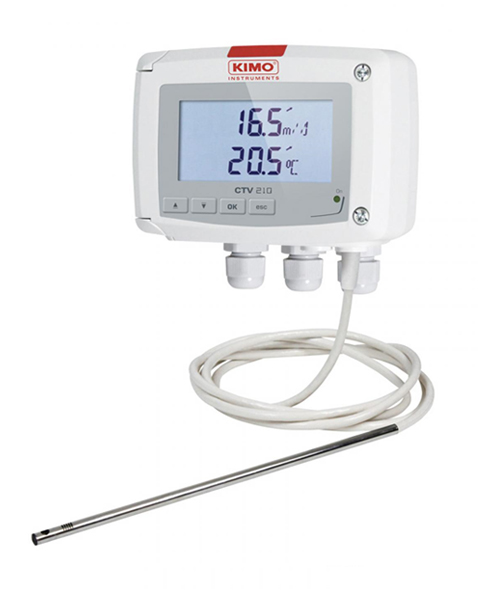 Kimo’s CTV 210-R is a transmitter with hotwire probe measuring air velocity from 0 to 30 m/s and temperature from 0 to +50°C.